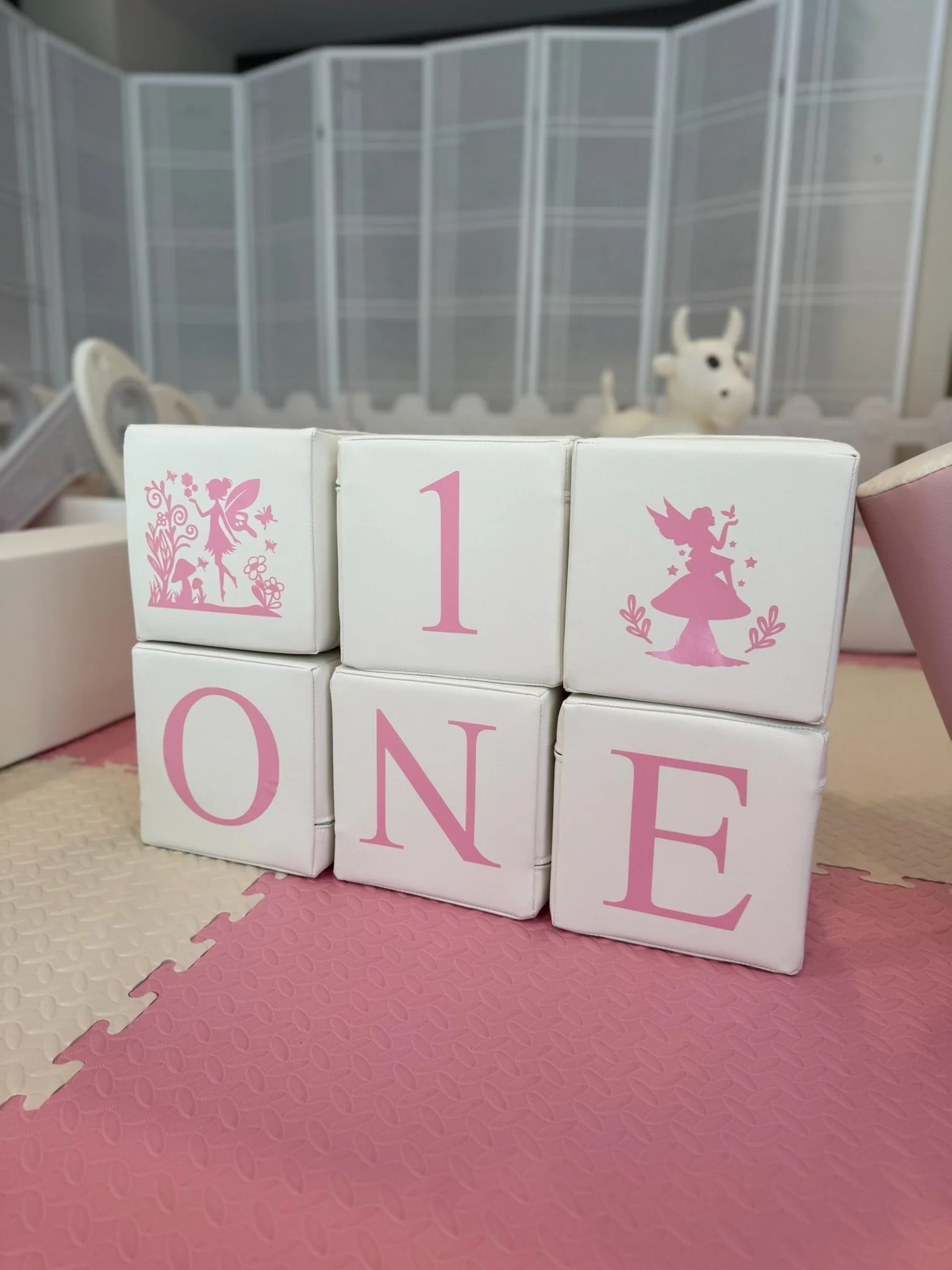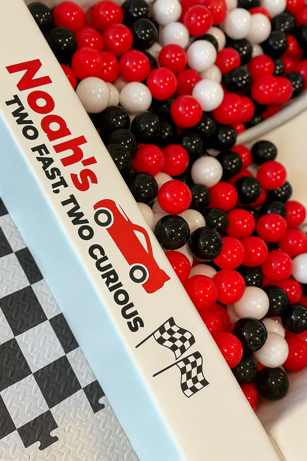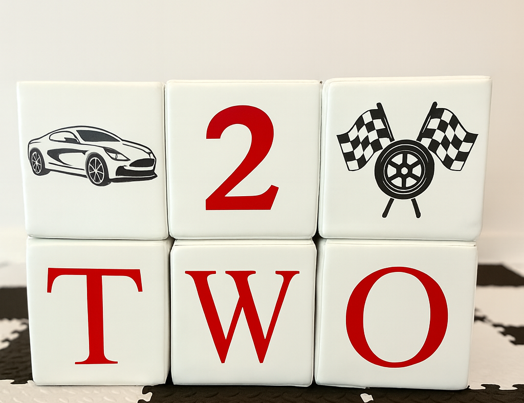 Add vinyl customization matching your party’s colors and theme to the ball pit and the soft play blocks