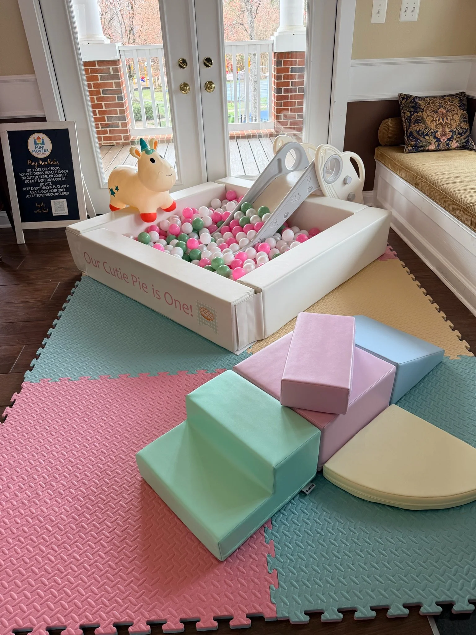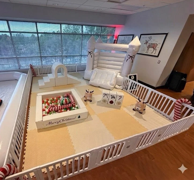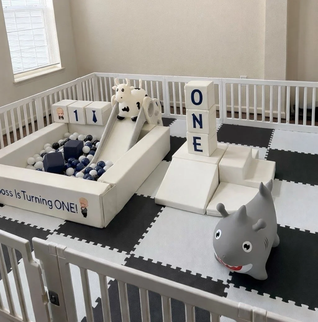 Includes: set up ● break down ● 5 hours ● gates ● mats ● ball pit ● balls ● slide ● climber ● 6 personalized soft play blocks ● 2 hoppers ● vinyl personalization
